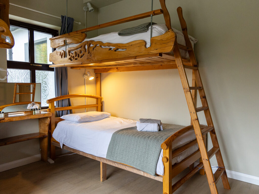 The dorm has 3 sets of hand-carved bunk beds. This budget bedroom is in the older accommodation building, so does not have the same quality or size or features as the bedrooms in the newly built en-suite accommodation. The bathroom which is shared with others is approx 3 metres from the bedroom.